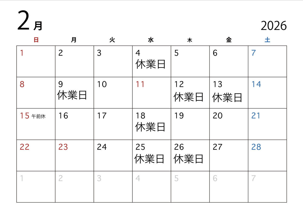 2月のお休み予定です。ご確認よろしくお願い致します。