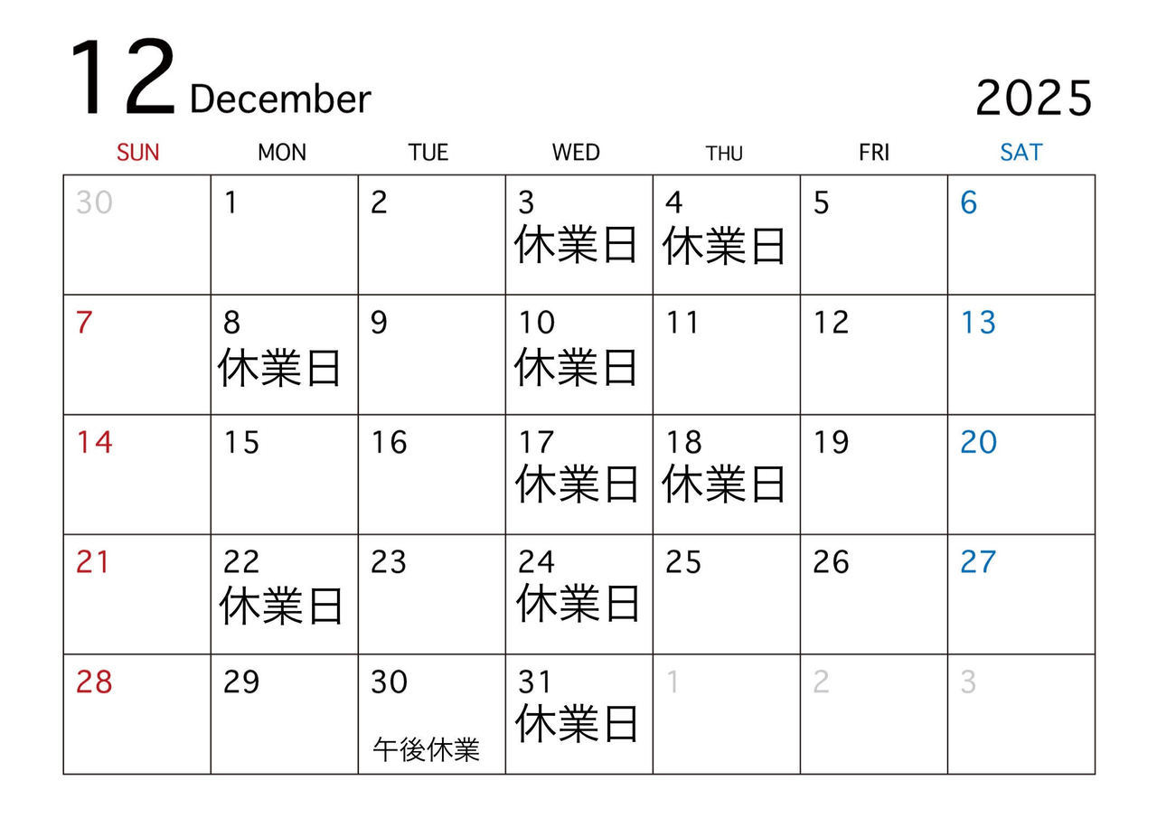 12月のお休み予定です。ご確認よろしくお願い致します。